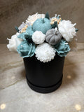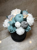 Frakt inom hela Sverige eller upphämtning på plats Elegant handgjord vaxbukett i hösttoner – En unik dekoration där pumpor och blommor i vax samspelar i mjuka nyanser av vitt, grått och blågrönt. Perfekt som hållbar inredningsdetalj eller en gåva som varar länge.