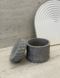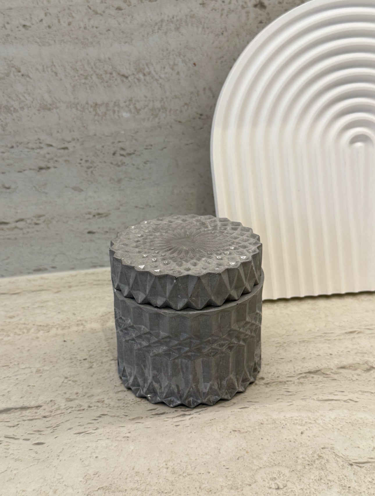 Frakt inom hela Sverige eller upphämtning på plats En stilren och modern förvaringsburk i betonglook med dekorativt geometriskt mönster. Det detaljerade locket och den matta ytan skapar en vacker kontrast mellan funktion och design. Perfekt att använda som liten förvaringslösning för smycken, nycklar, bomullspads eller andra småsaker – samtidigt som den blir en dekorativ inredningsdetalj i hemmet.