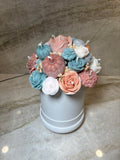 Frakt inom hela Sverige eller upphämtning på plats. En romantisk bukett av handgjorda vaxblommor i mjuka nyanser av rosé, puderrosa och blågrönt. De skimrande pumporna blandas med rosor och småblommor och skapar en varm, drömlik känsla. Perfekt som en hållbar dekoration som sprider både elegans och charm i hemmet. Ett unikt konstverk som aldrig vissnar – och alltid drar blickarna till sig.