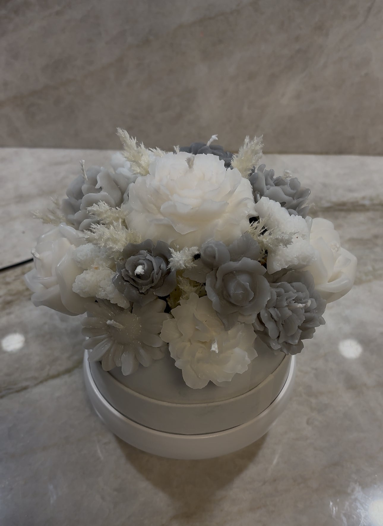 Frakt inom hela Sverige eller upphämtning på plats. Stilren handgjord vaxbukett i vitt och silver med lyxig vit velvet box– En exklusiv kombination av rosor och pioner i eleganta kontraster. Den tidlösa färgskalan gör buketten perfekt som en sofistikerad inredningsdetalj eller som en unik gåva som håller för alltid.